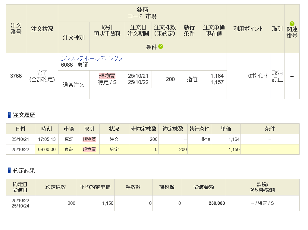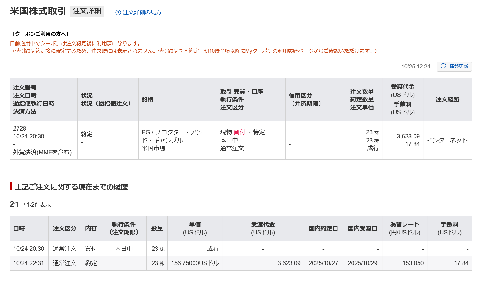 日本株の日本電技、ジオリーブグループ、昭和システムエンジニアリング、明豊ファシリティワークス、南総通運、ハリマビステム、オーテック、日本リーテック、構造計画研究所ホールディングス、フォーラムエンジニアリング、アイエックス・ナレッジ、シイエム・シイ、アジアパイルホールディングス、東邦システムサイエンス、学究社、ダイナパック、プロシップ、フォーカスシステムズ、平山ホールディングス、日本プロセス、東海ソフト、アルトナー、ヒップ、IMV、シンメンテホールディングスを購入、アメリカ株のTXN、CMEを購入、MOを配当再投資、アメリカ株のPGを購入