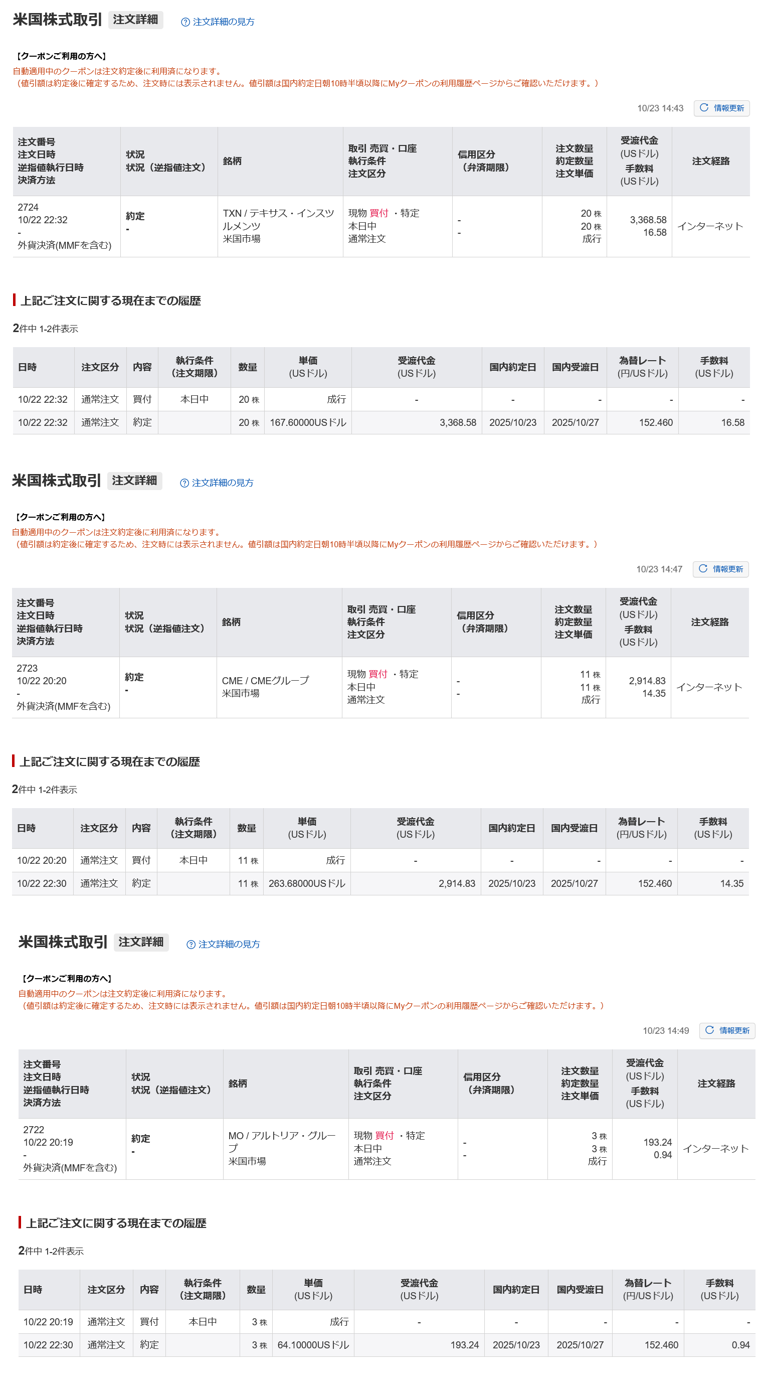 アメリカ株のTXN、CMEを購入して、MOを配当再投資して、