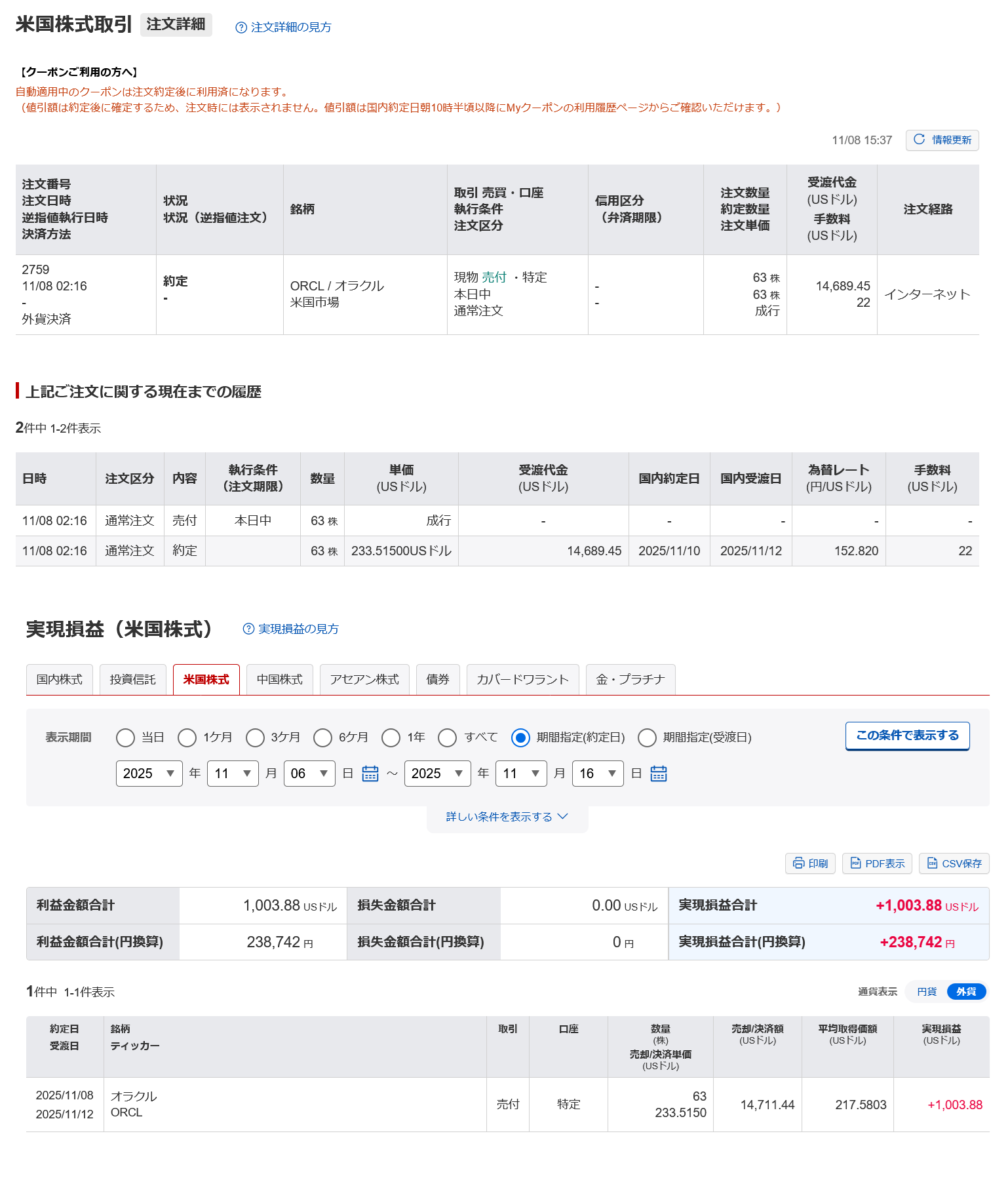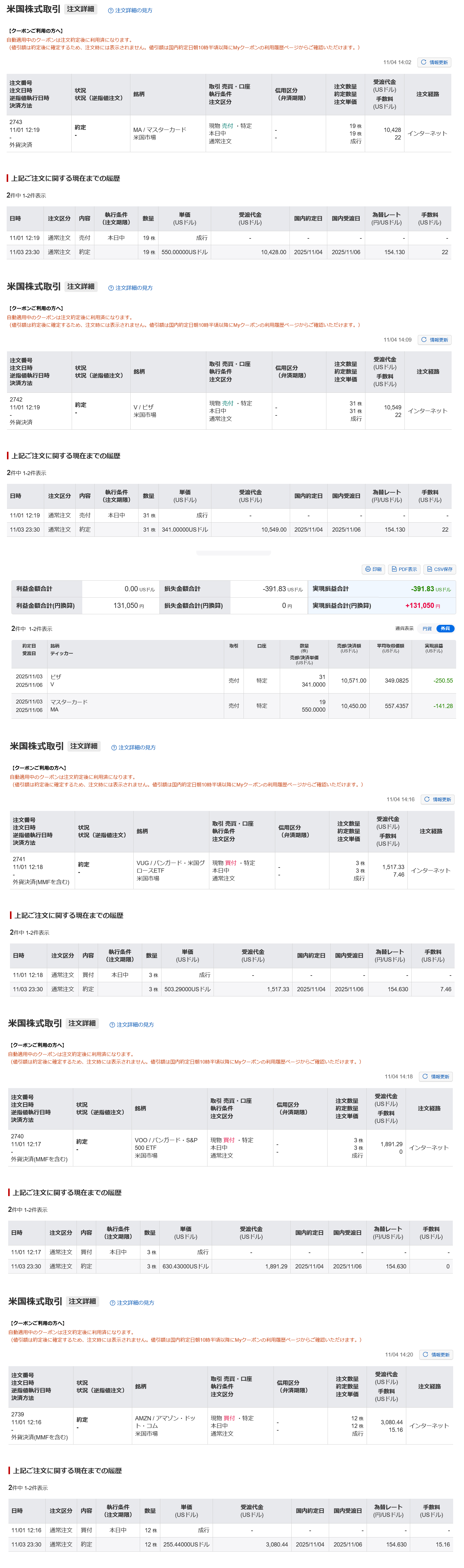 アメリカ株のMA、Ⅴを売却、VUGを3株、VOOを3株、AMZNを購入、日本株のNEC、ヒップ、野村不動産HDを購入、大末建設をデイトレード、アメリカ株のLOWを配当再投資、日本株の大末建設、田辺工業を購入、NCDを利確売却、アメリカ株のORCLを利確売却