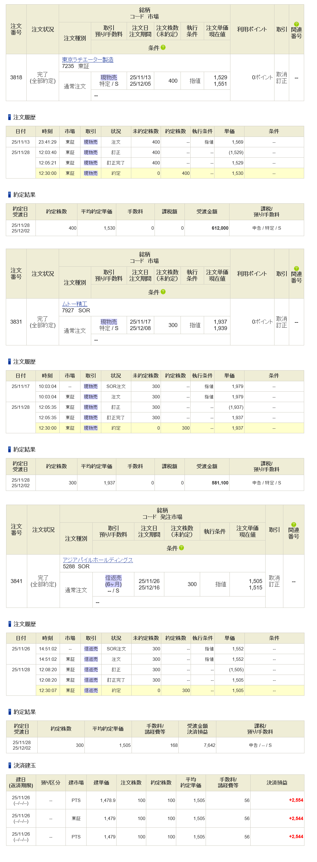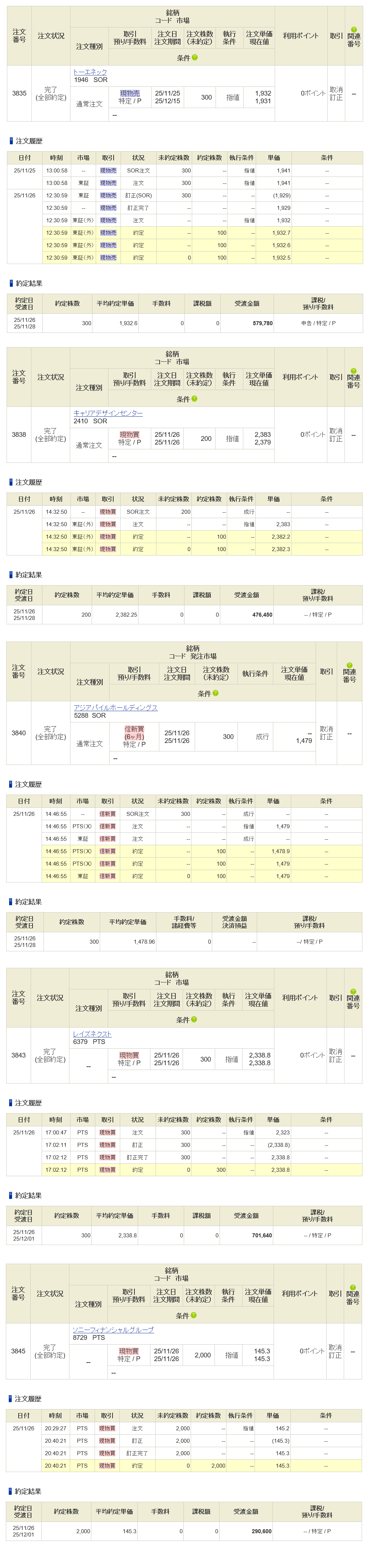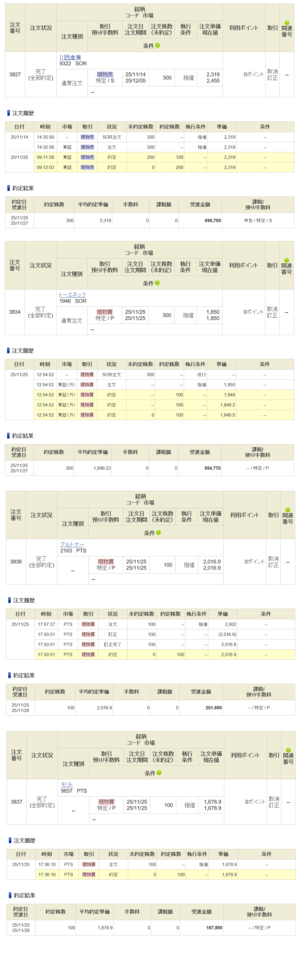 日本株の川西倉庫を売却、トーエネック、アルトナー、モリトを購入、トーエネックを売却、キャリヤデザインセンターを購入、アジアパイルホールディングスを信用買い、レイズネクスト、ソニーフィナンシャルグループを購入、東京ラヂエーター製造、ムトー精工、アジアパイルホールディングスを売却、アメリカ株のETFであるVUG、VOOを2株ずつ購入、PAYXを配当再投資