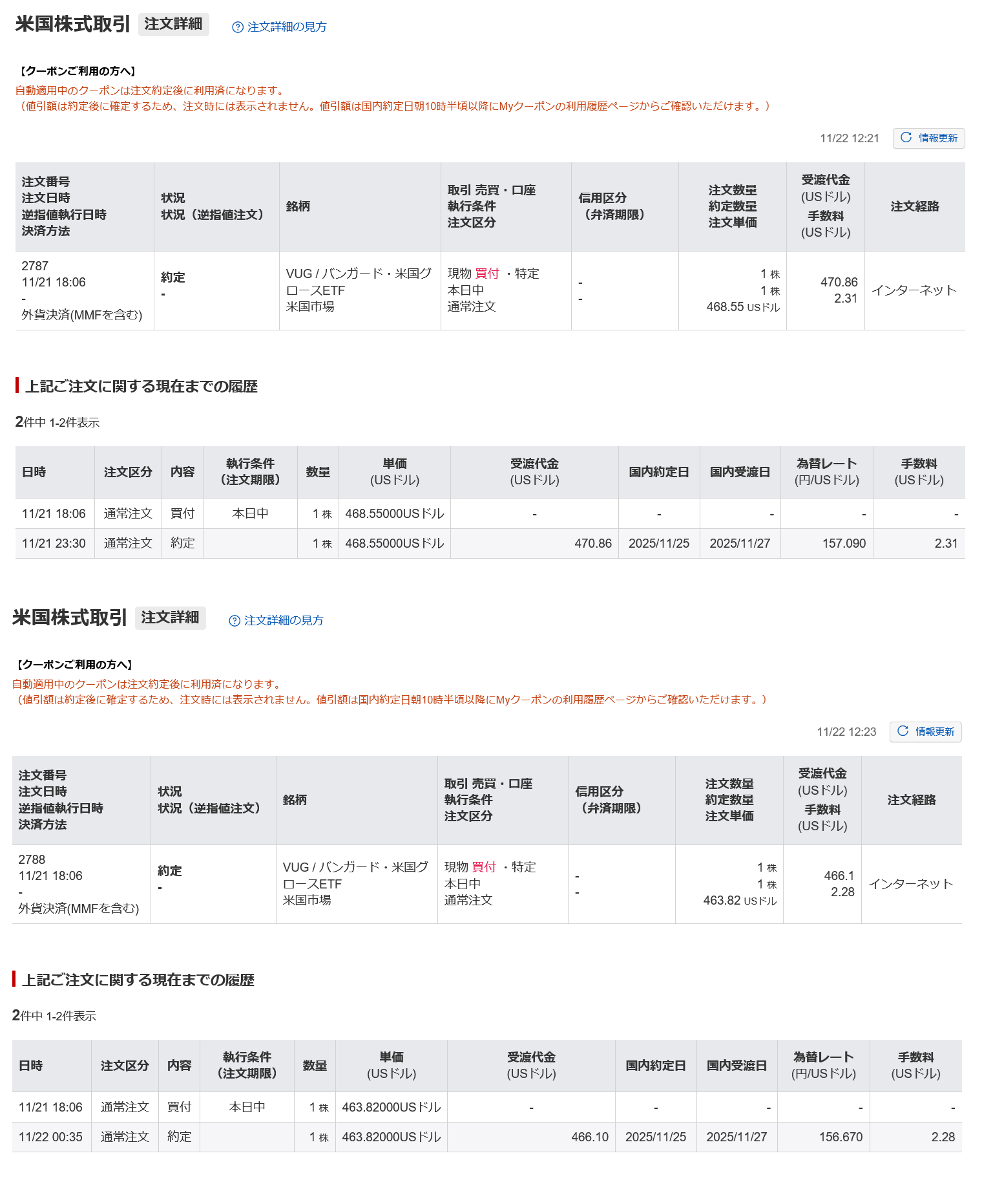VUGを3株、VOOを3株、AMZNを購入して、